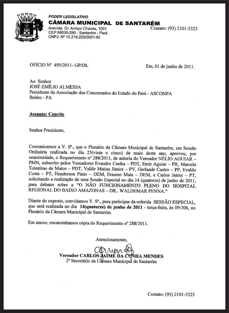 A Asconpa convoca todos os aprovados nos concursos realizados pela Sespa, com lotação no Hospital Regional de Santarém, para a Sessão Especial na Câmara de Vereadores do município, que debaterá as mazelas de funcionamento do HRBA.
