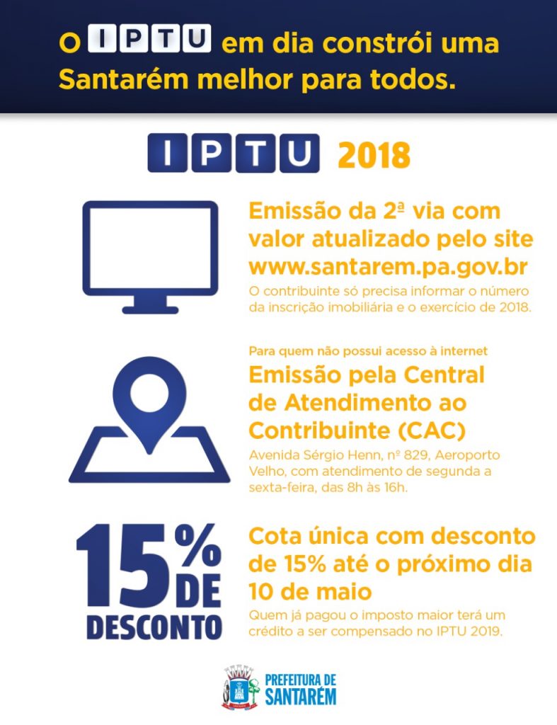 Arquivo 2018 Arquivo Geral IPTU 2018 – SANTARÉM 9 de abril de 2018 - 18:46:009 de dezembro de 2019 - 21:38:06 blogdobetinho 0 comentários PREFEITURA DE SANTARÉM Total de Visualizações 1,729 total views, Visto hoje 6 views today http://www.siap.santarem.pa.gov.br/servlet/ps_iptu
