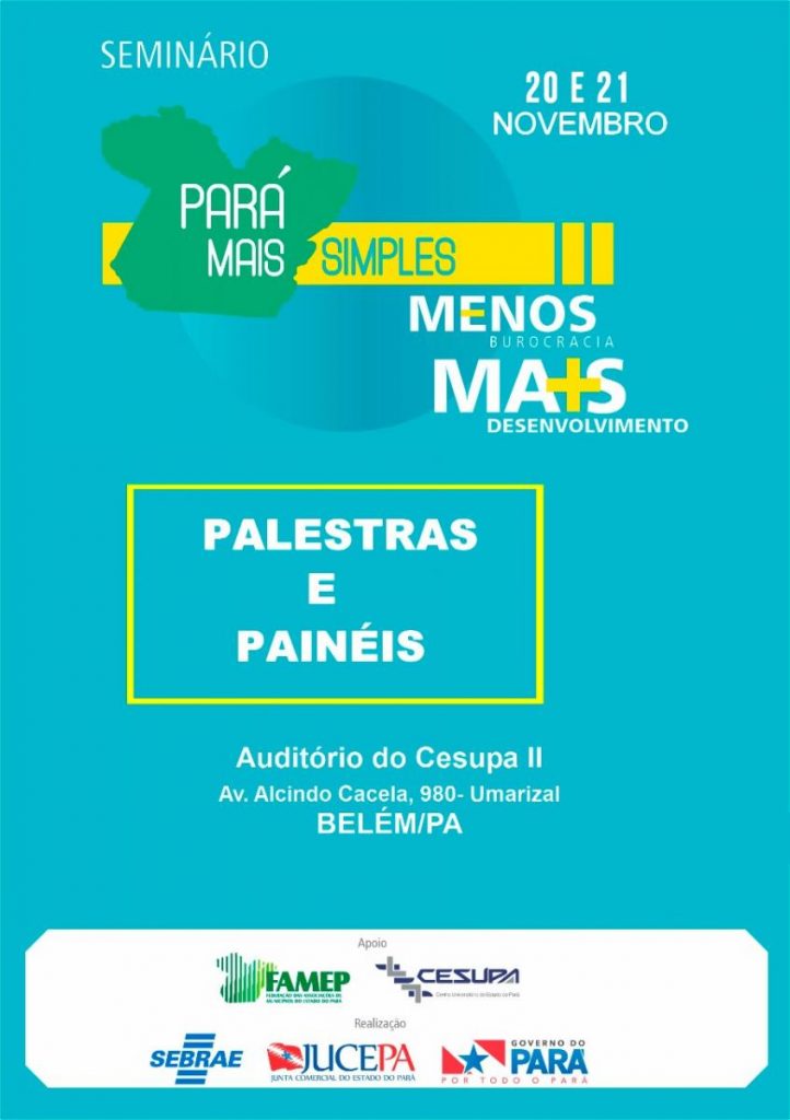 A Junta Comercial do Estado Pará, o Serviço Brasileiro de Apoio às Micro e Pequenas Empresa – Sebrae/PA, e o Governo do Estado, realizarão em Belém, o Seminário Pará Mais Simples. Com o tema Menos Burocracia, mais Desenvolvimento, o seminário acontecerá, no auditório do CESUPA, localizado na Av. Alcindo Cacela, 980, nos dias 20 e 21 de novembro de 2019, e tem como objetivo debater com prefeitos, gestores, servidores públicos, municipais e estaduais sobre a importância da simplificação e desburocratização do registro e licenciamento empresarial.