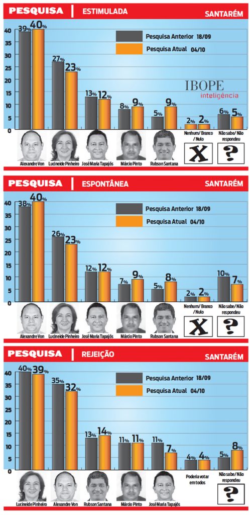 Nova pesquisa Ibope sobre a corrida eleitoral em Santarém, no oeste do Estado, divulgada ontem, revela que o candidato Alexandre Von, do PSDB, continua na liderança com 40% das intenções de votos, um ponto a mais que na primeira pesquisa divulgada pelo Diário no dia 18 de setembro.