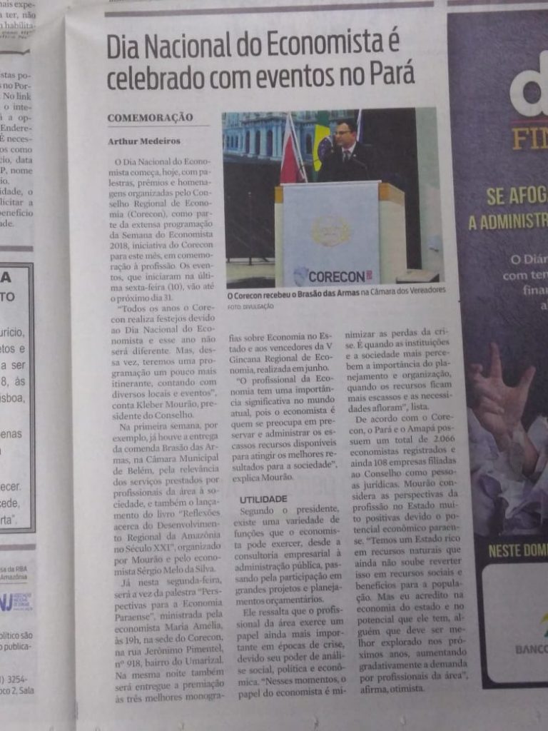 Arquivo 2018 Arquivo Geral DIA DO ECONOMISTA 13 de agosto de 2018 - 14:06:009 de dezembro de 2019 - 21:39:07 blogdobetinho 0 comentários Total de Visualizações 1,678 total views, Visto hoje 3 views today Diário do Pará de hoje, página A5, dando destaque para a programação do Corecon PA para a Semana do Economista 2018 e a homenagem inédita recebida na Câmara dos Vereadores de Belém.