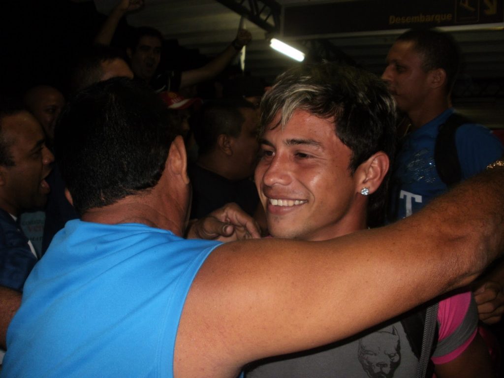 Atacante Ricardinho abraçado por um torcedor no desembarque azulino hoje de madrugada