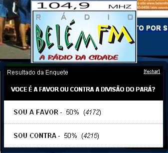 O site da rádio http://www.belemfm.com.br/, mostra um empate entre as duas frentes, com o oSIM com 4.172 votos, e o NÃO com 4.215 votos.